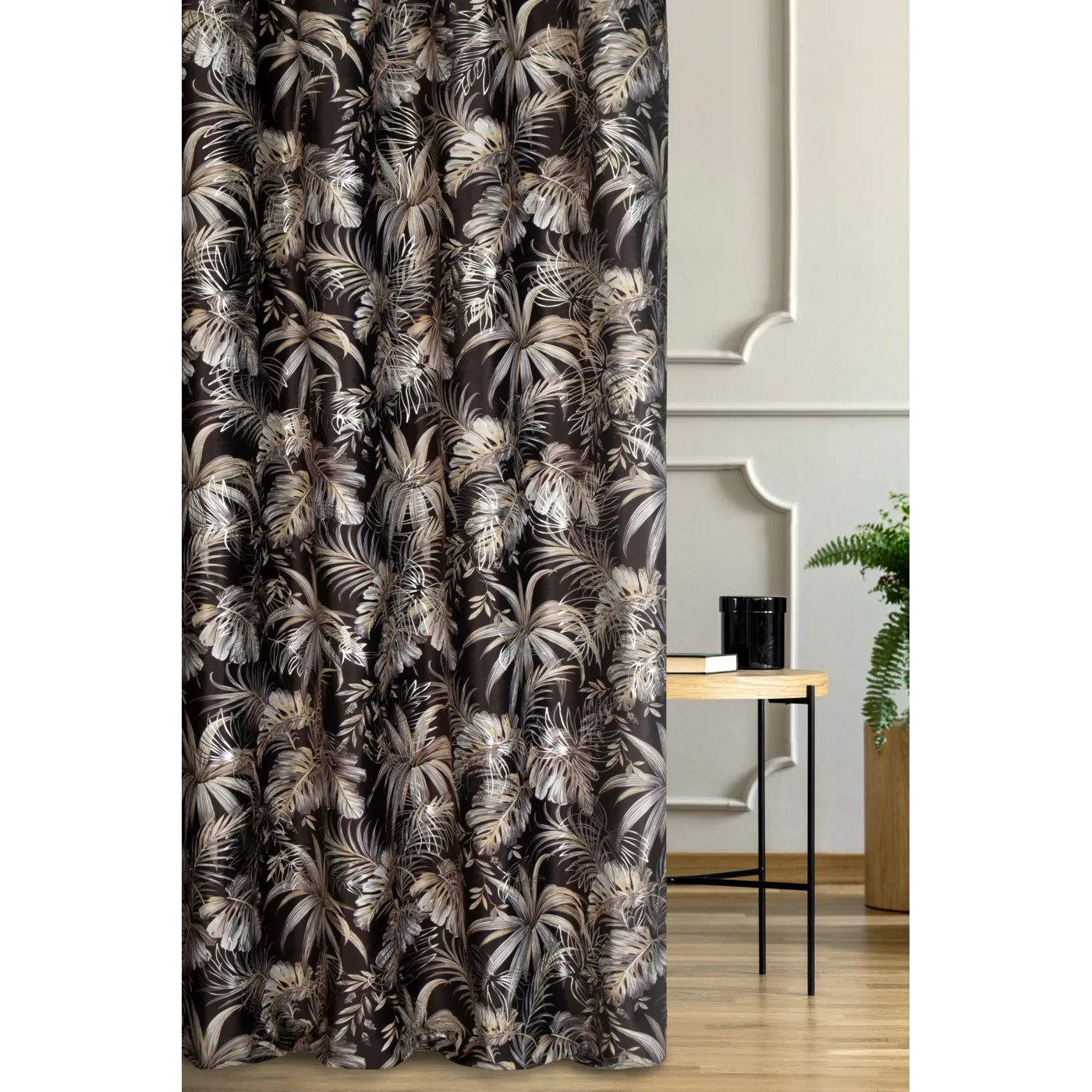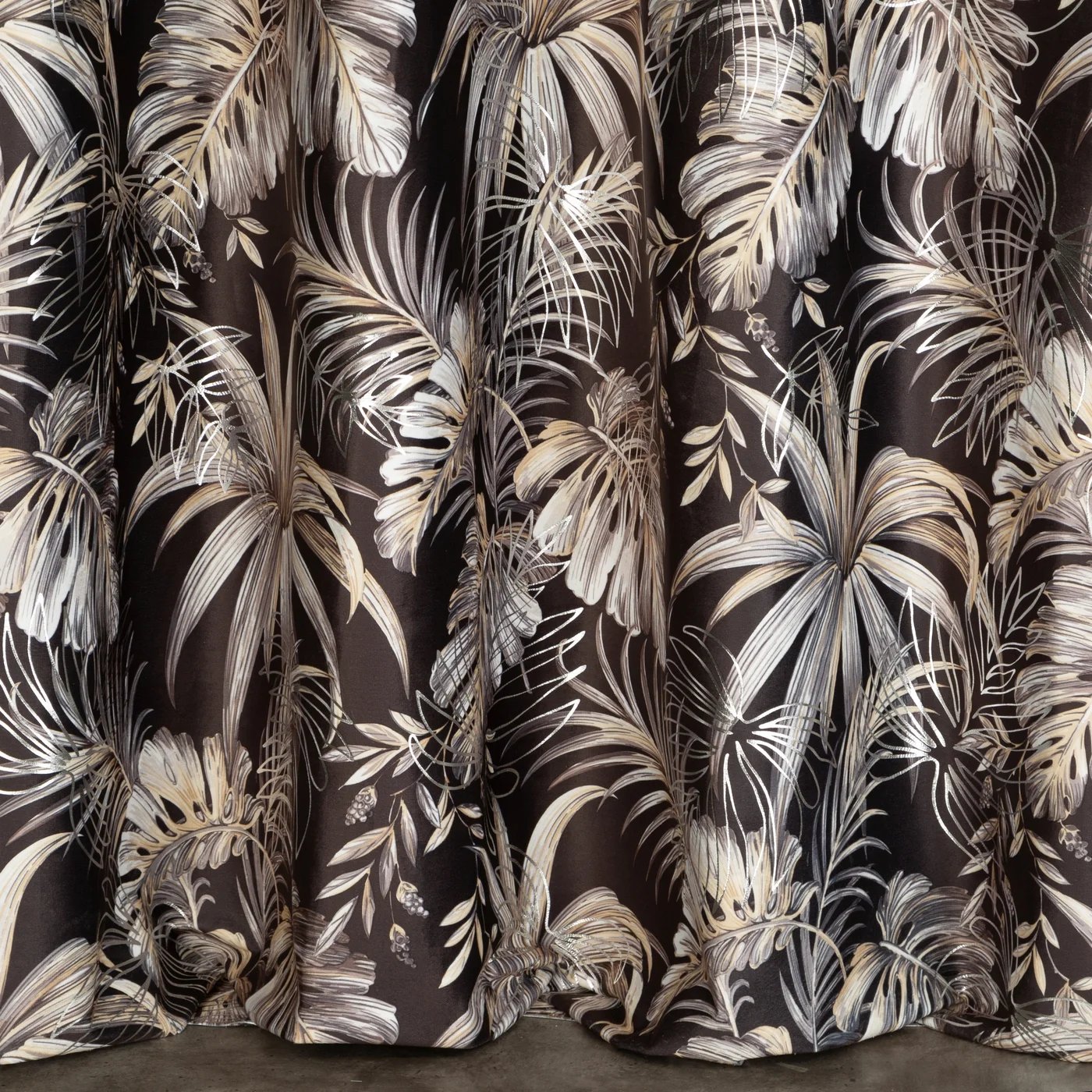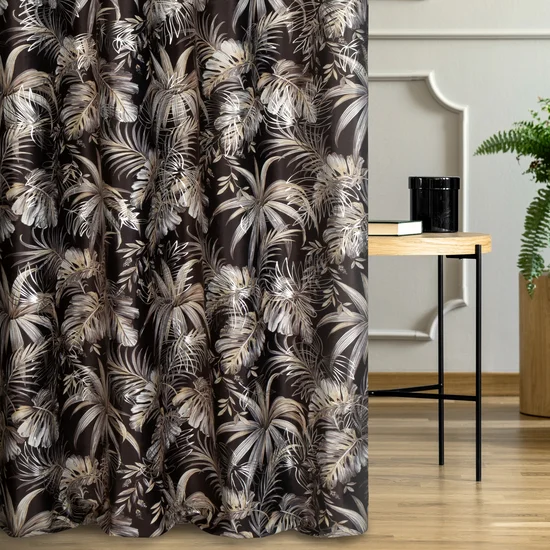 Závěs Rodos, látka příjemný a hebký velvet - samet, botanický vor v černo hnědavé koloristice, stříbřitý siluetový přetisk listy monstery