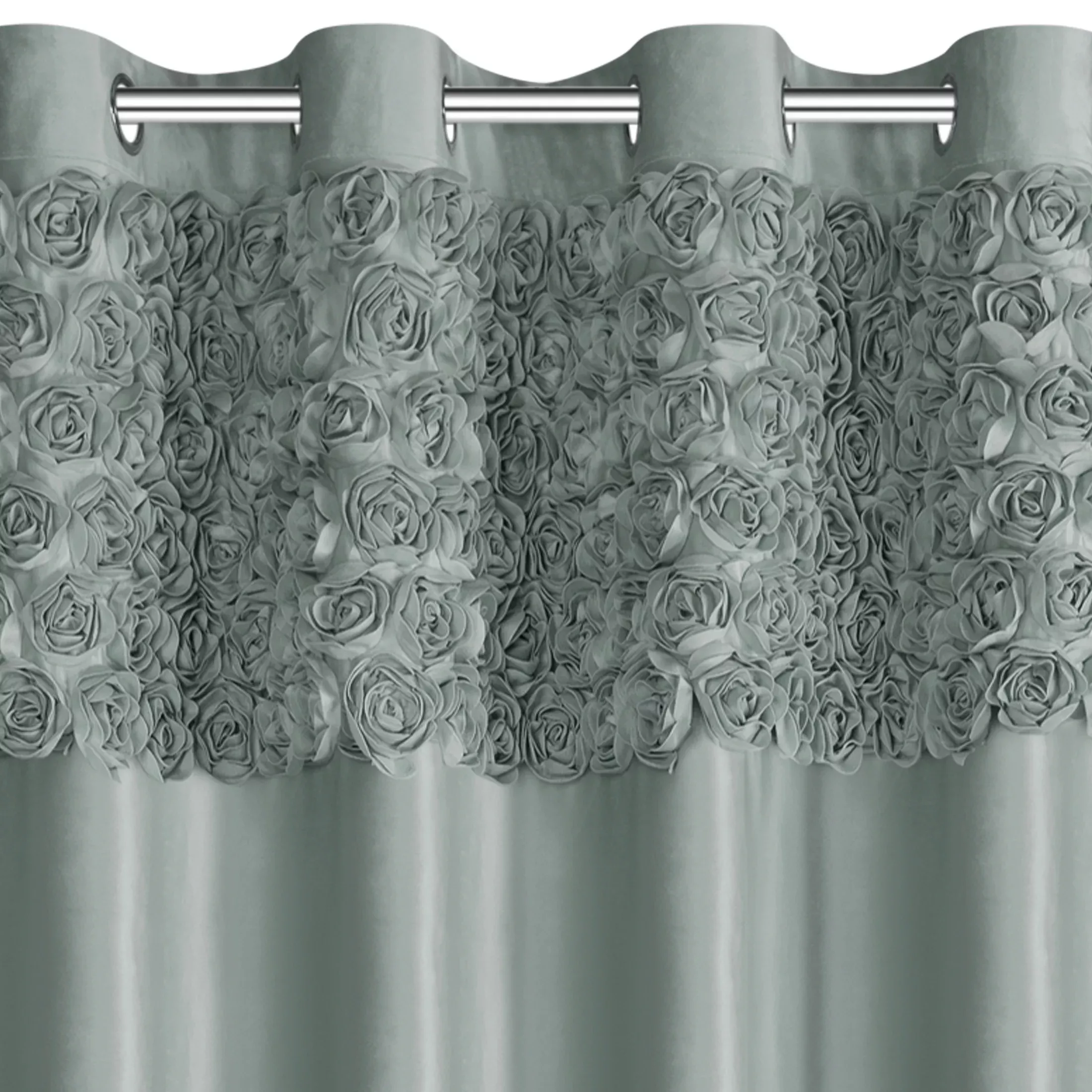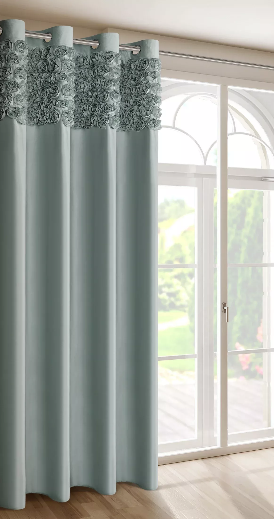 Závěs Roses by Eva Minge, látka velvet s 3D aplikací v horní části, barva mátová, velikost 140x250cm, na kroužcích, výšku lze zkrátit