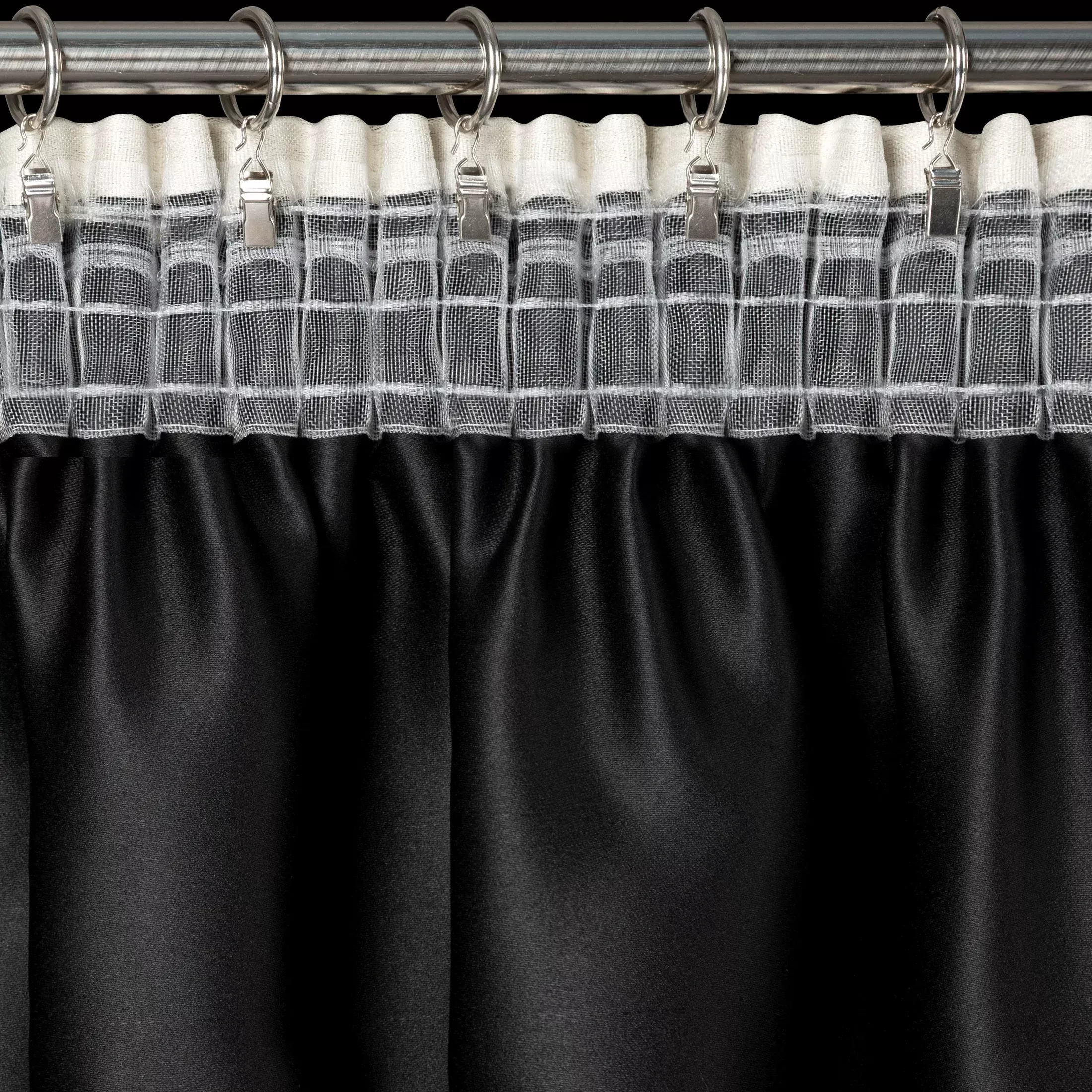 | Zavěšení | za stužky řasící pásky na háčky na garnýži, na háčky na stropní kolejničce, shora za okraj pásky žabkami, přímo na garnýžovou tyč do tunýlku za páskou |