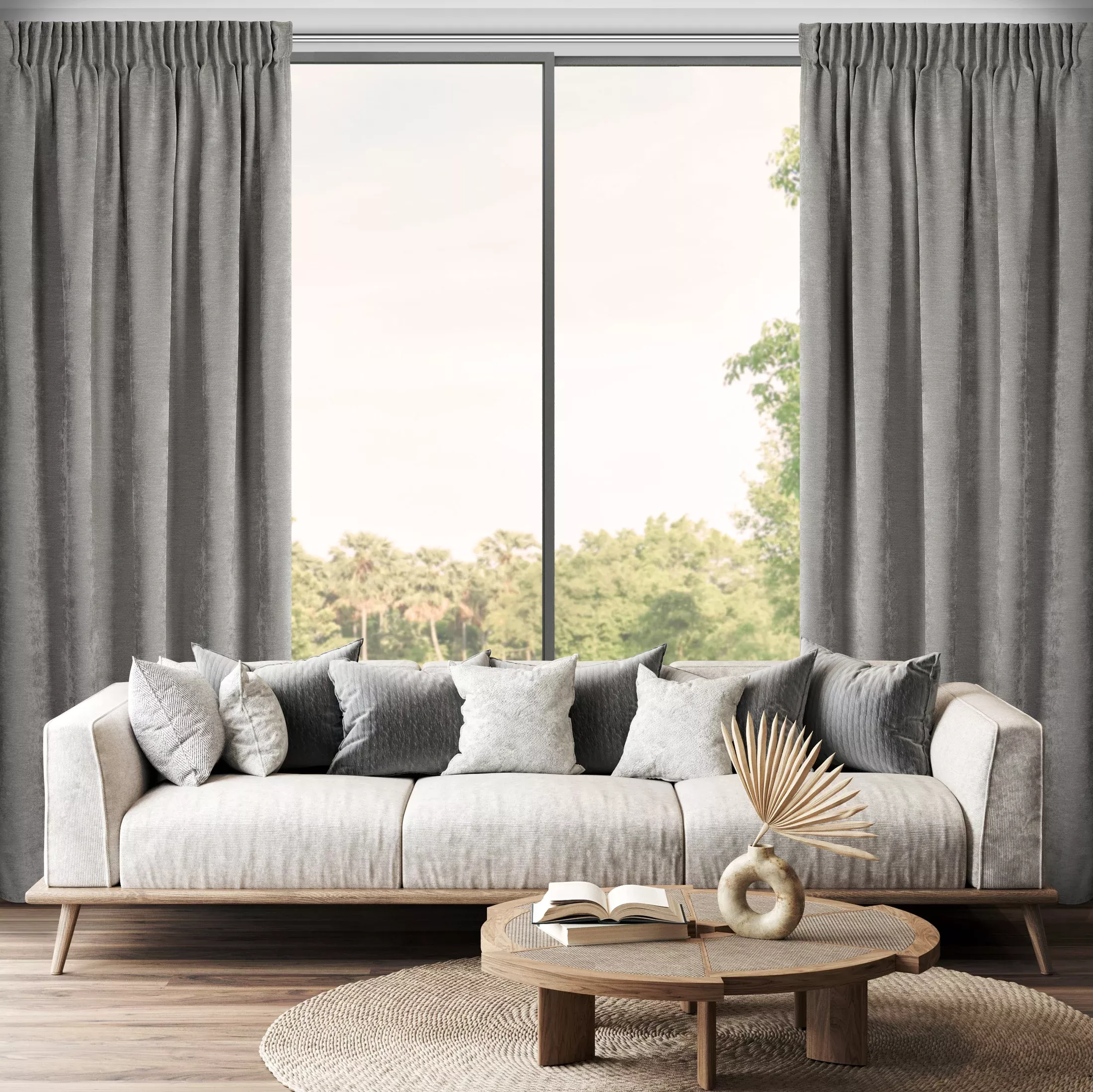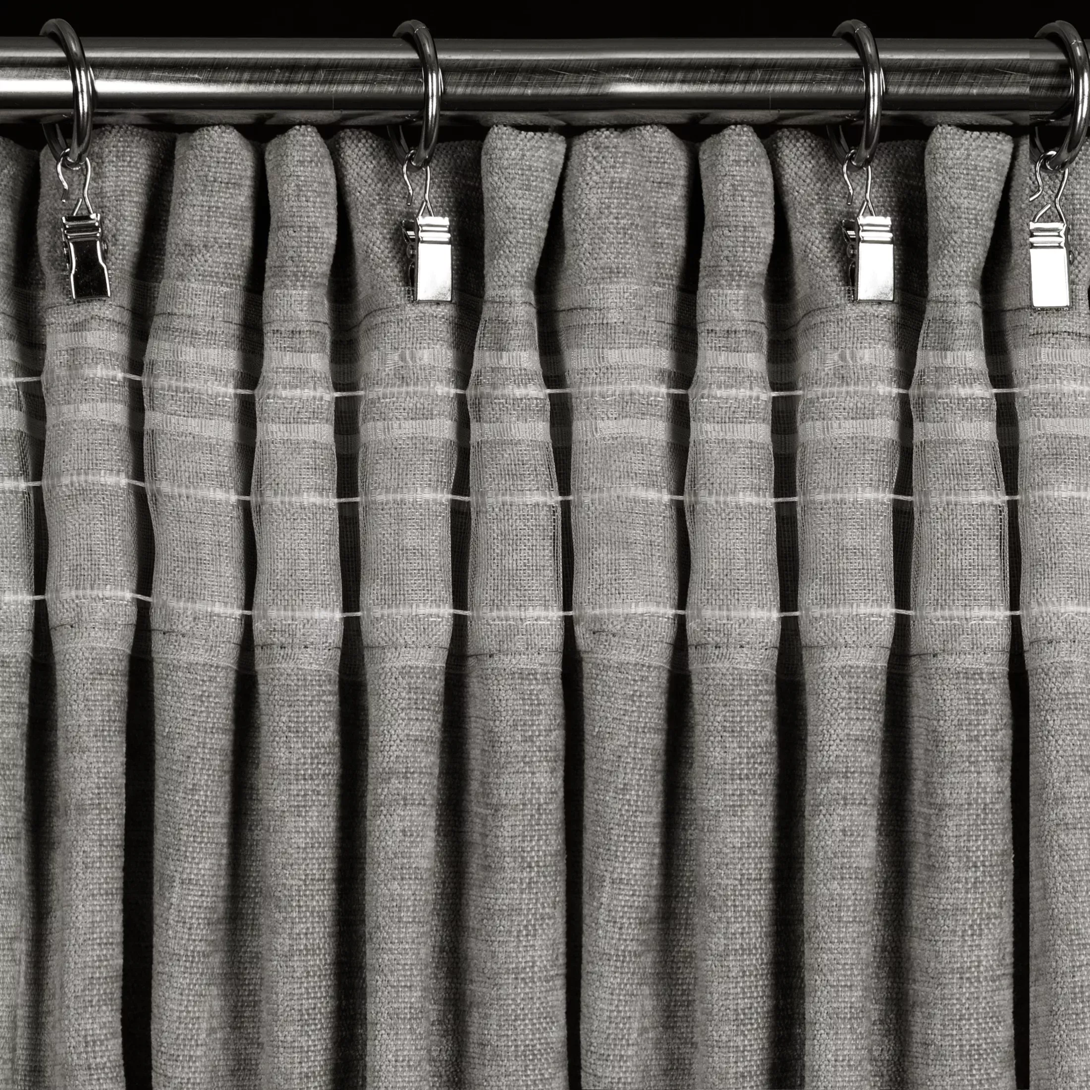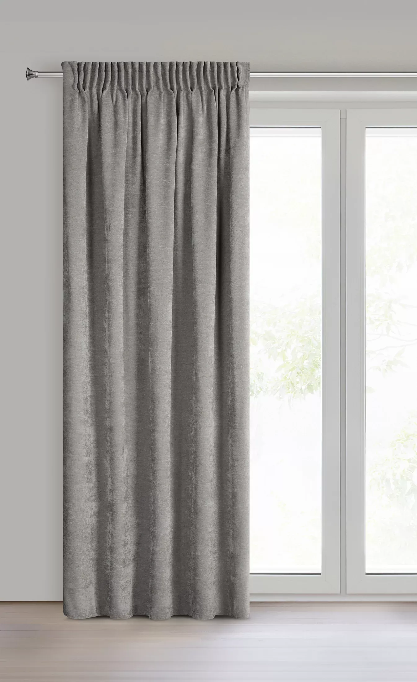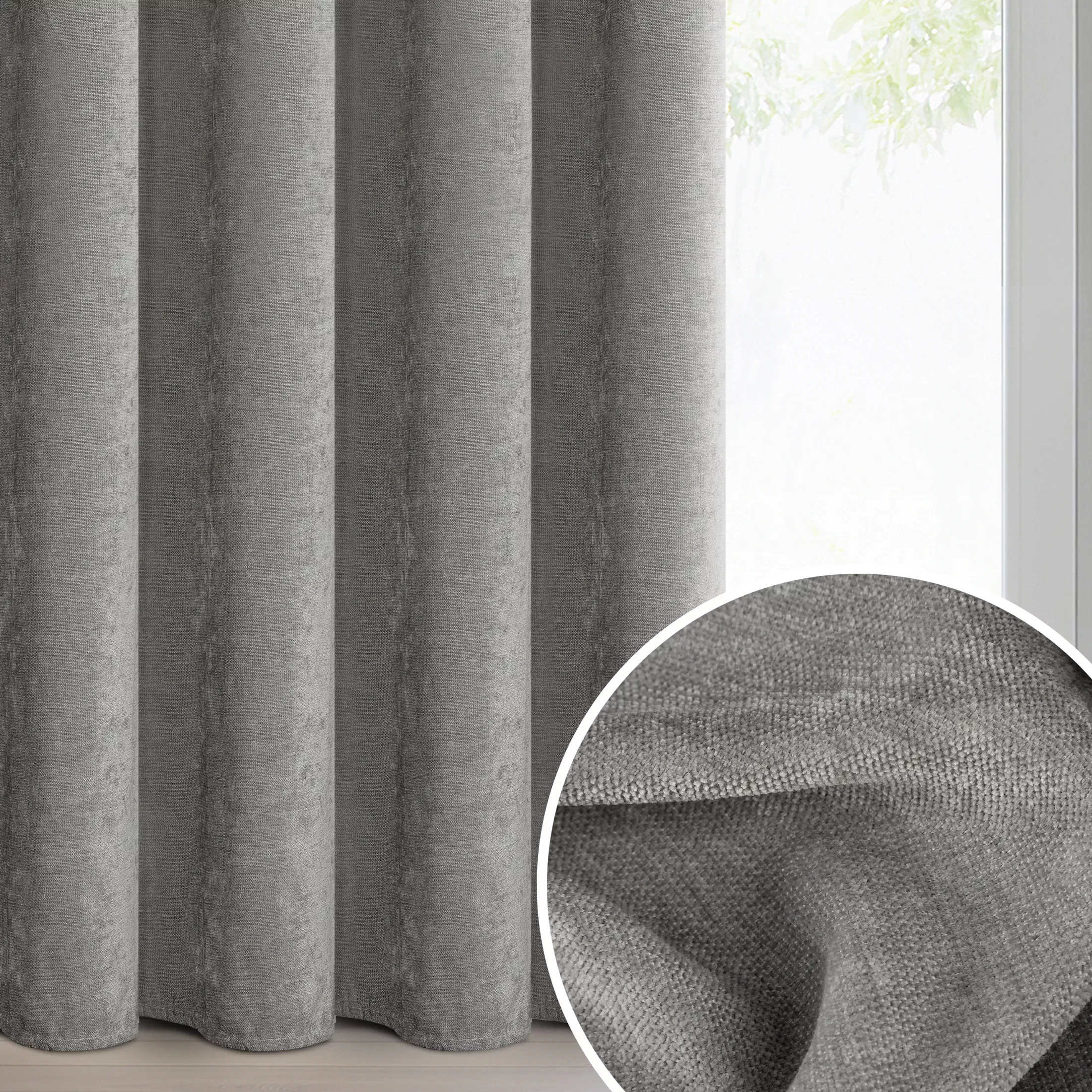 Závěs Vani, hebký šenil s výrazným přírodním splotem, barva šedá, řasící páska nebo tunýlek, 140x270cm, výšku lze zkrátit