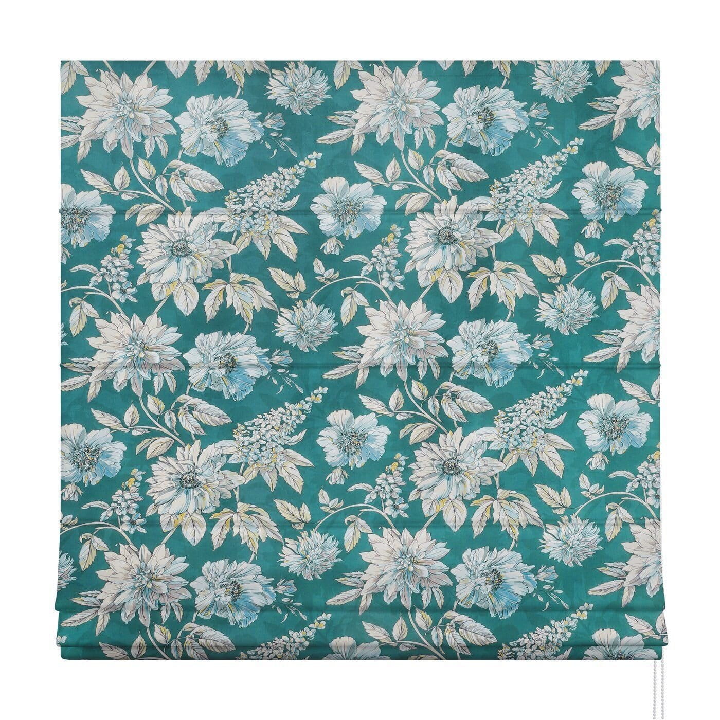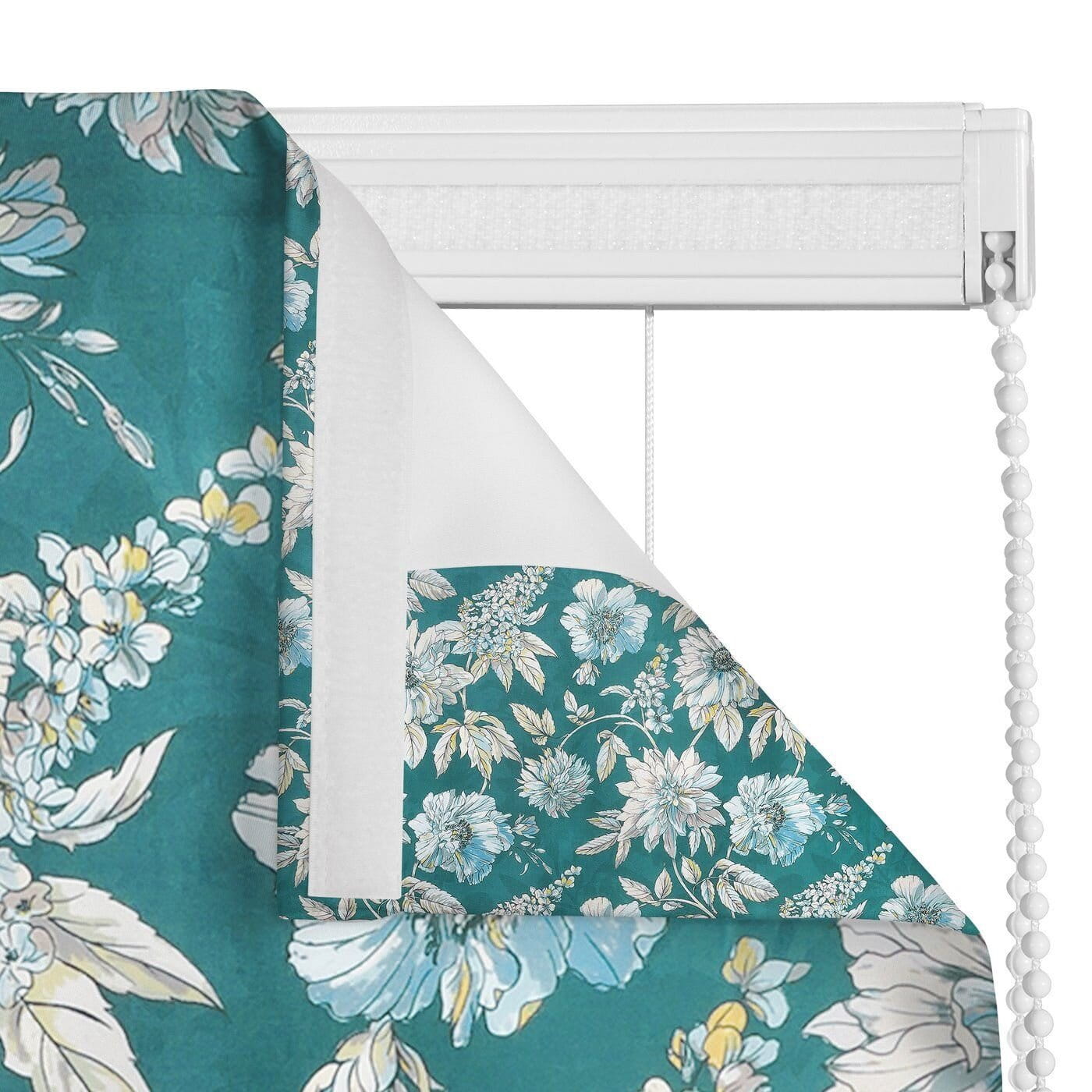 Římská roleta šitá na míru Misha, hustě tkaná látka typu dimout silně stínící, tyrkysový podklad se stylizovaným květovým potiskem