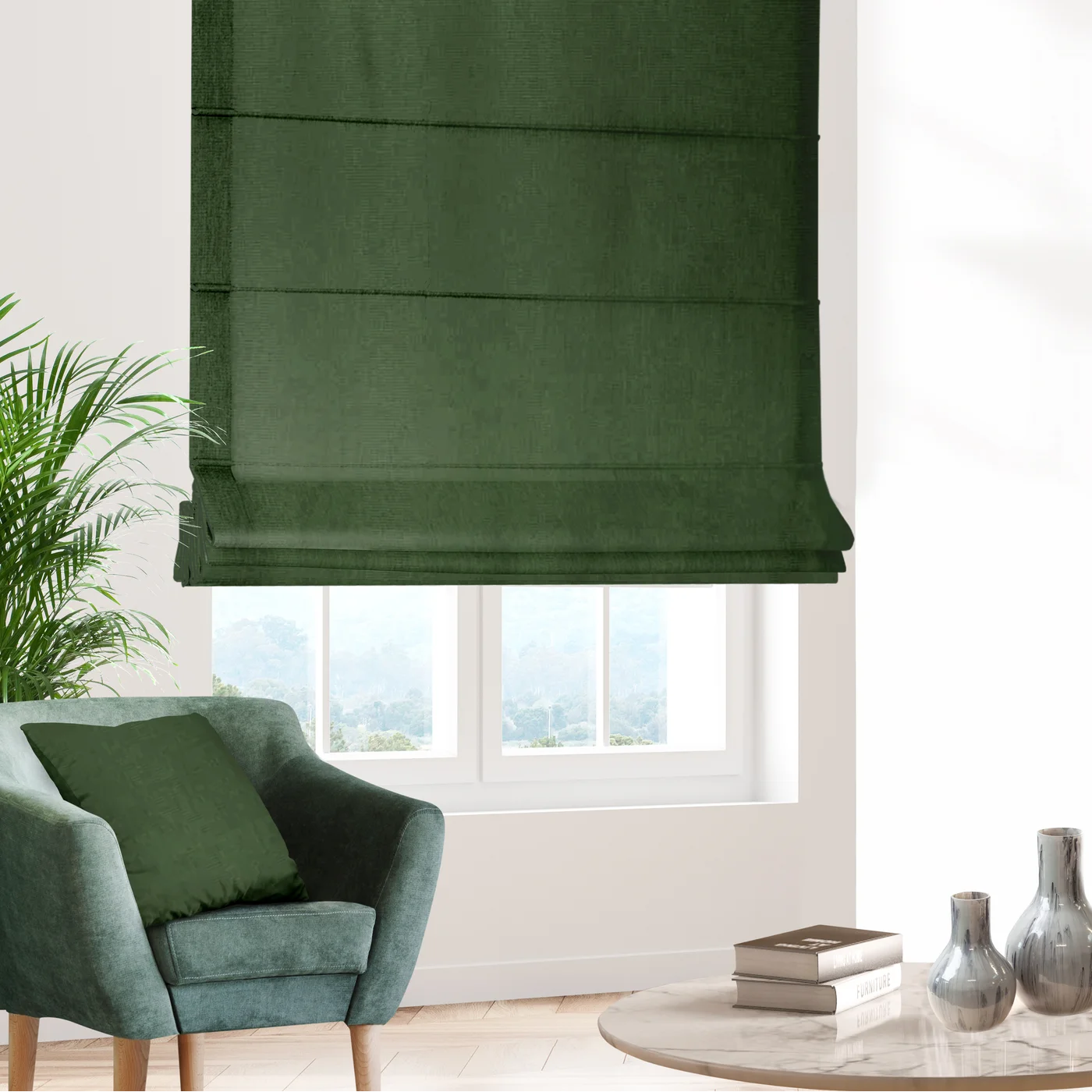Římská roleta šitá na míru kolekce STYLE LX ECO, látka přírodního vzhledu s drobnou strukturou, v látce jemná lesklá nitka pro vizuální zjemnění plochy rolety, barva tmavě zelená lahvová