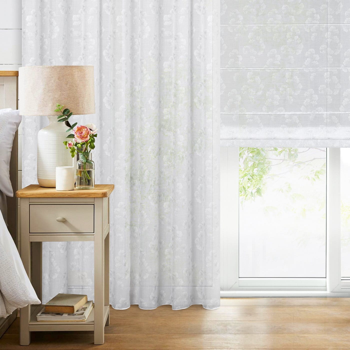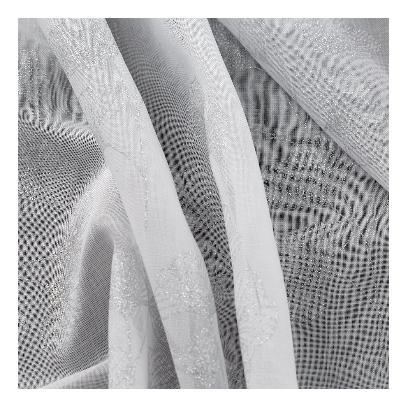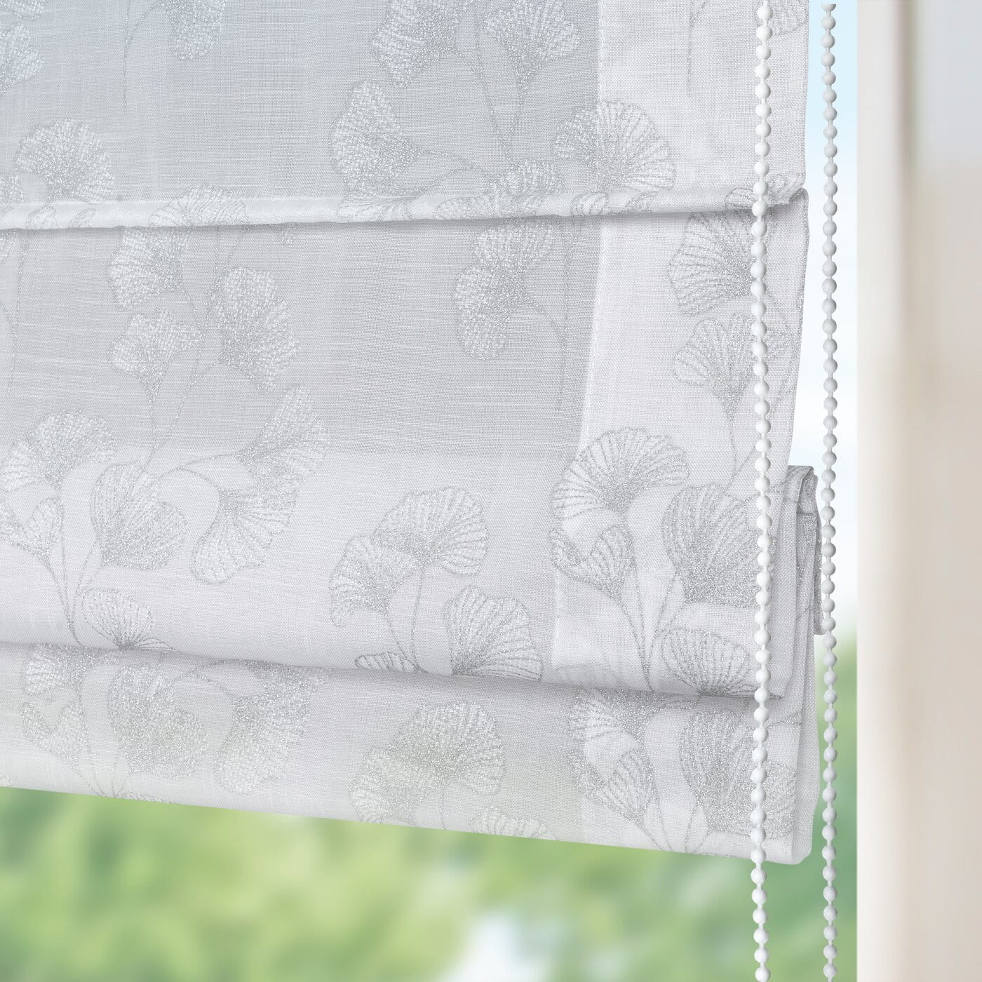 Římská roleta na míru Rabi5 ALL, hustší etamína, na ploše jemný stříbrný potiskem listy ginkgo.