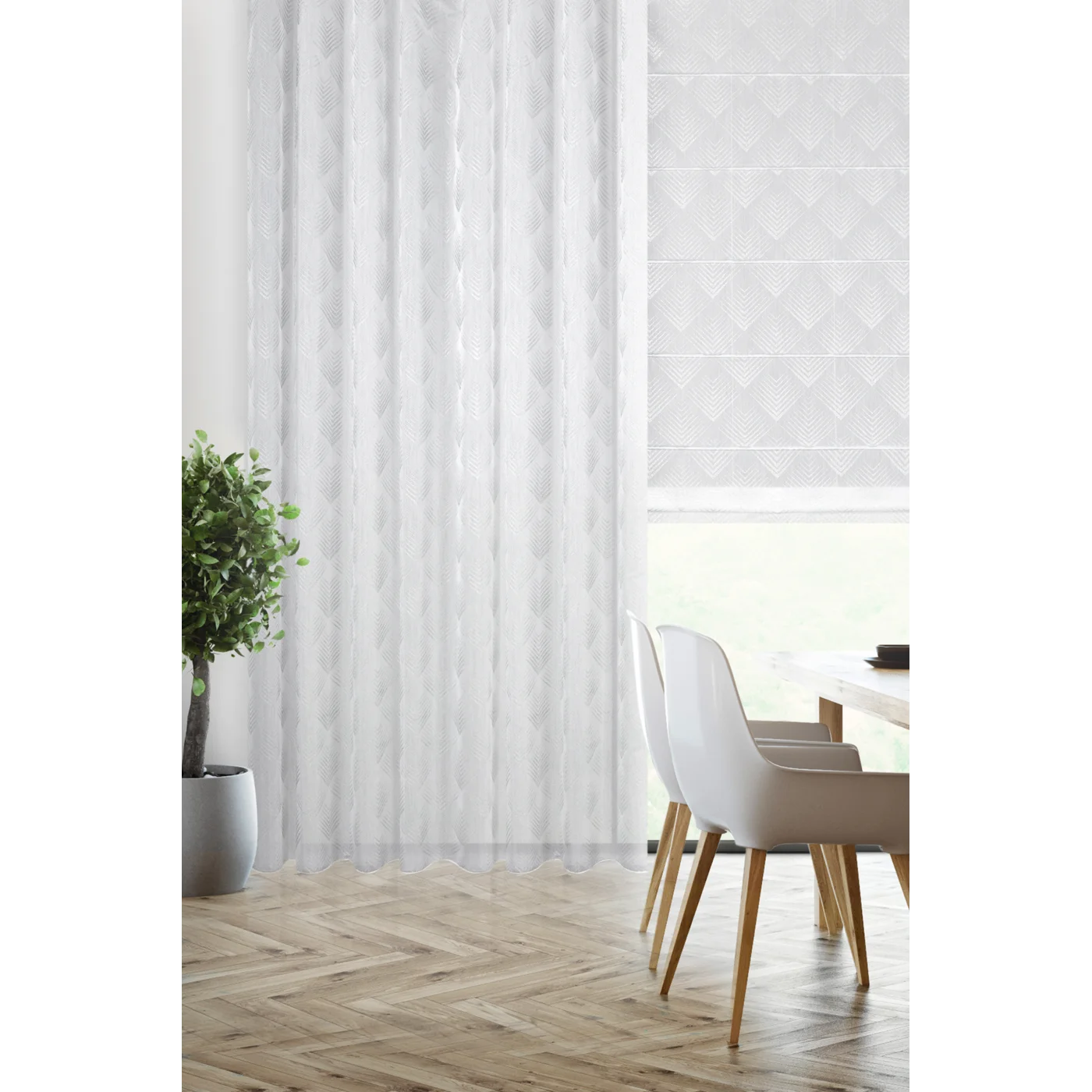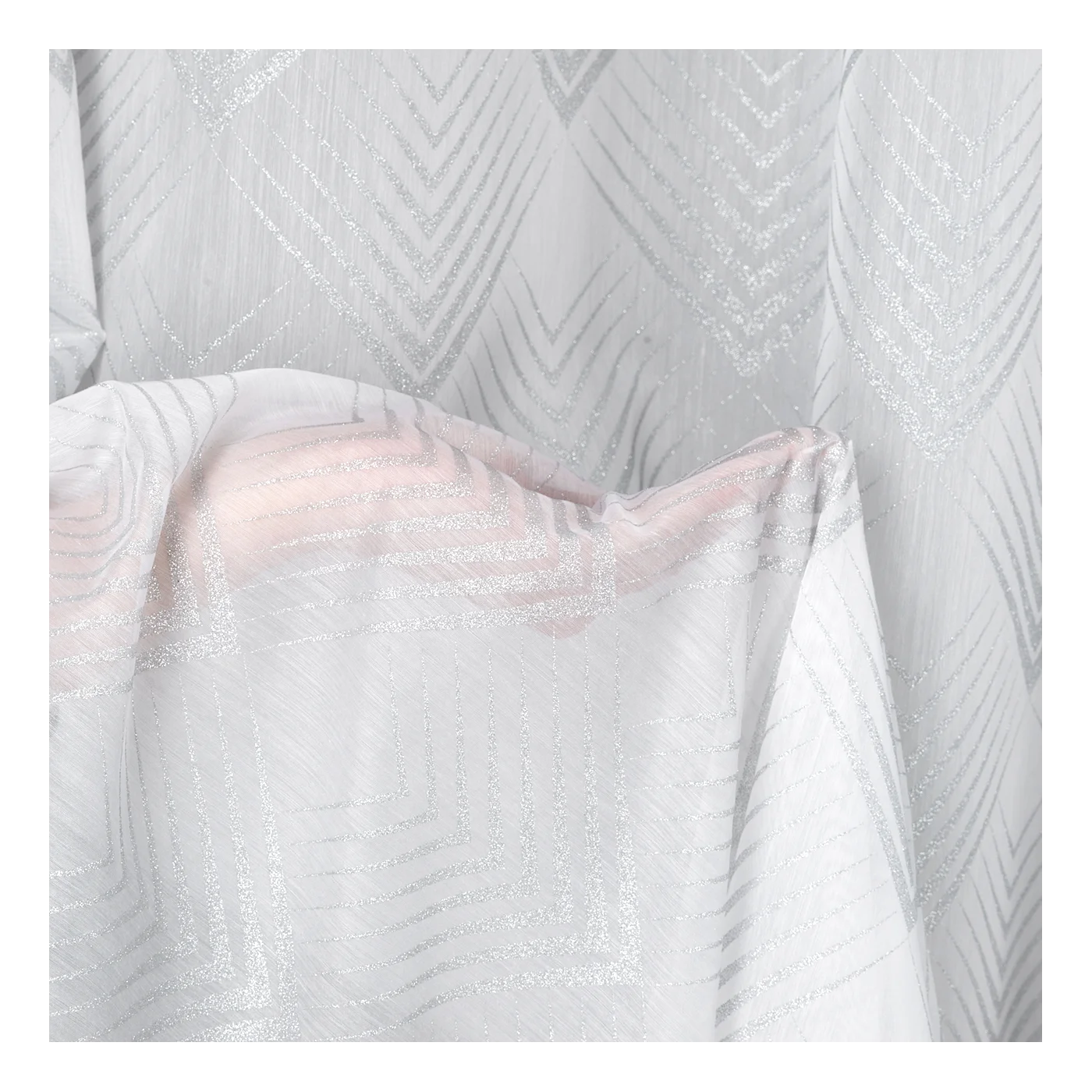 Záclona Rabi7, šití na míru, matný bílý batist, elegantní stříbřitý potisk geometrický vzor Art Deco, dole zátěžový steh
