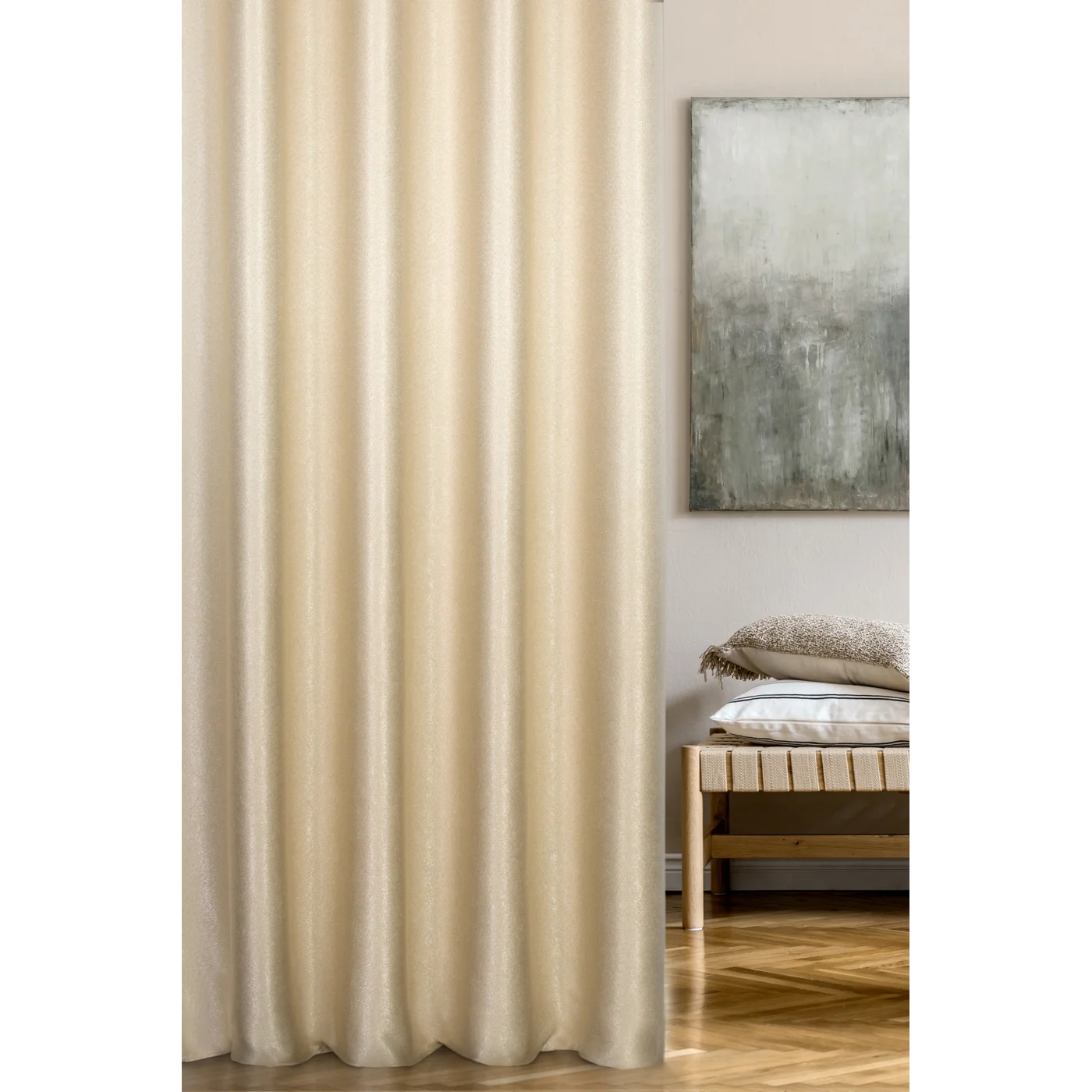 Závěs Vegas Glamour, hustě tkaná látka je měkká a příjemná, s leskem, barva béžová