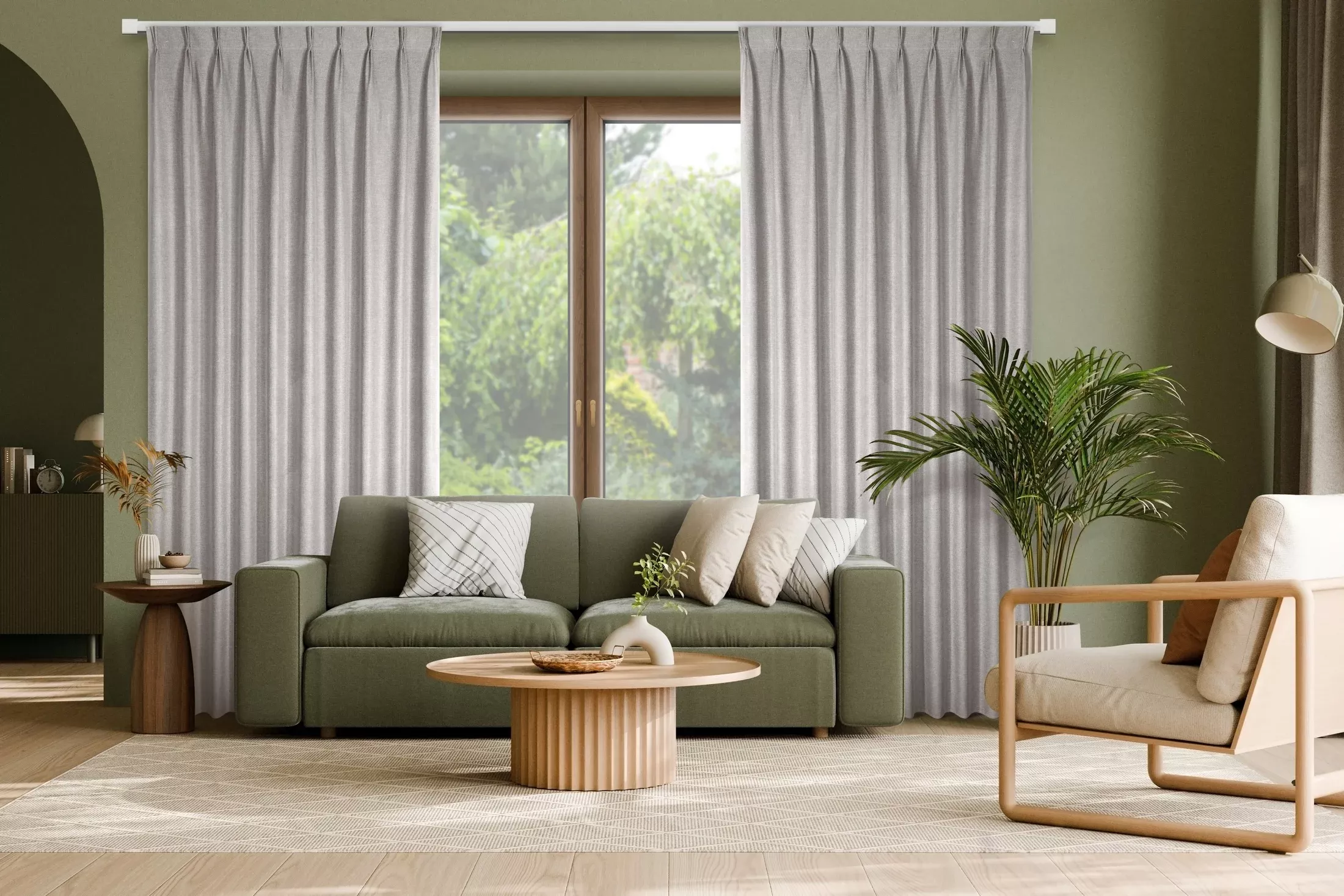 Látka typ blackout 100%, barva béžová tmavší melanž, zatemní interiér a zajistí dokonalé soukromí.