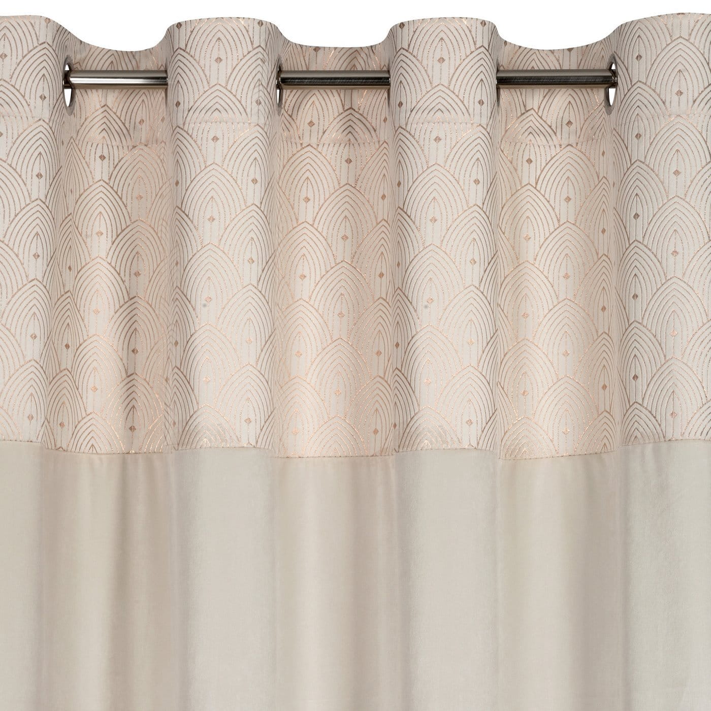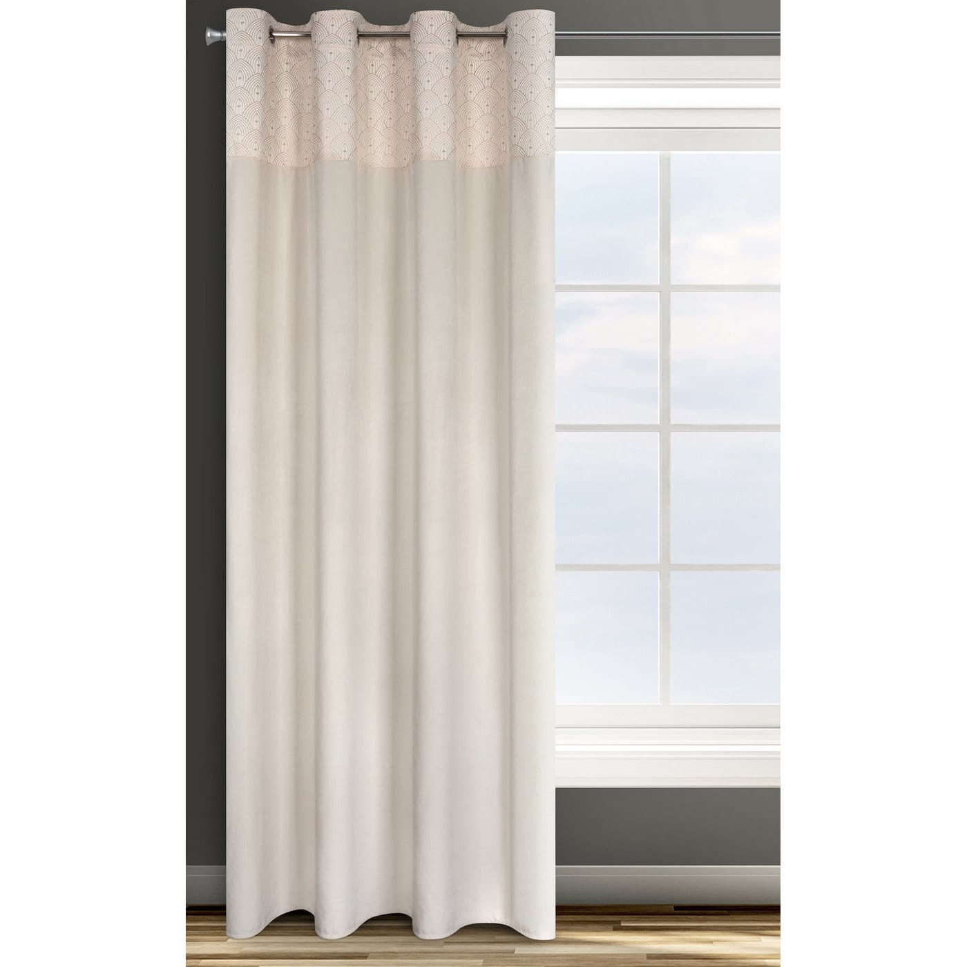 Řada závěsů Agnes - měkký velvet samet, nahoře dekorace látkou v odvozené barvě + potisk orientálním vzorem v šampaňské barvě.